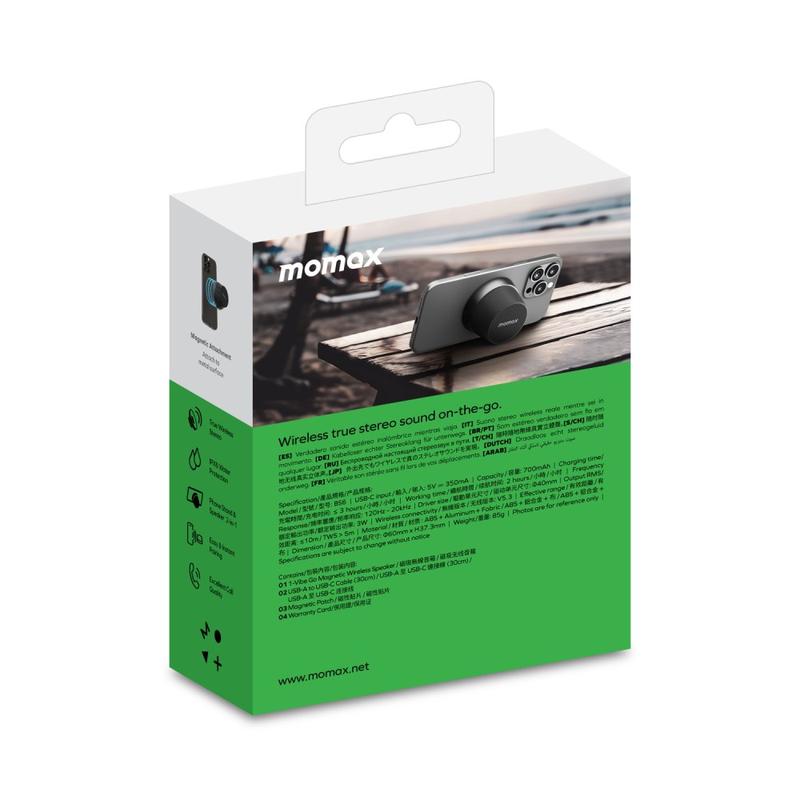 A mini coluna Bluetooth magnética MOMAX 1-Vibe Go BS6 é uma solução de áudio compacta e versátil, concebida para entretenimento diário em casa ou em viagem. O seu design magnético ultracompacto combina uma coluna sem fios portátil com um prático suporte para telemóvel, permitindo-lhe desfrutar de música, vídeos e chamadas com facilidade. Equipada com um potente driver de 40 mm e saída de som de 360°, proporciona um áudio envolvente num formato surpreendentemente pequeno, enquanto a resistência à água IPX6 a torna adequada para uso diário em diferentes ambientes.