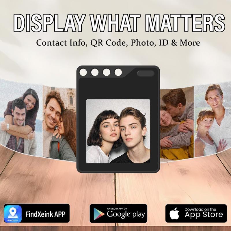 - O ecrã personalizável suporta fotos, texto, detalhes de contacto e códigos QR através da aplicação FindXeink