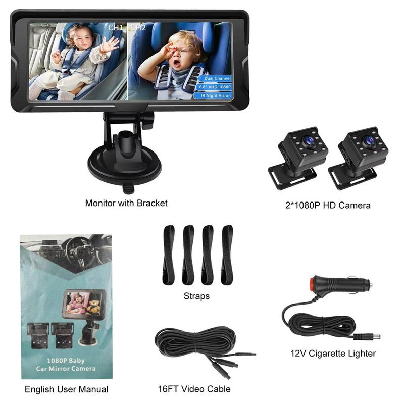 Monitor de bebé para automóvel de 6,8 polegadas - Duas câmaras HD 1080P com rotação de 360º, visão de ângulo amplo e visão nocturna por infravermelhos