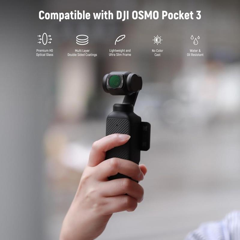 Construído com vidro ótico HD, cada filtro possui 30 camadas de revestimentos multifuncionais em ambos os lados. Estes revestimentos tornam os filtros repelentes de água, resistentes a riscos e à prova de óleo, garantindo durabilidade e desempenho ótico consistente em várias condições ambientais. As armações dos filtros são fabricadas em liga de alumínio leve mas robusta, maquinada com precisão por CNC para se integrar perfeitamente no Osmo Pocket 3 sem afetar a calibração ou o armazenamento do gimbal.
