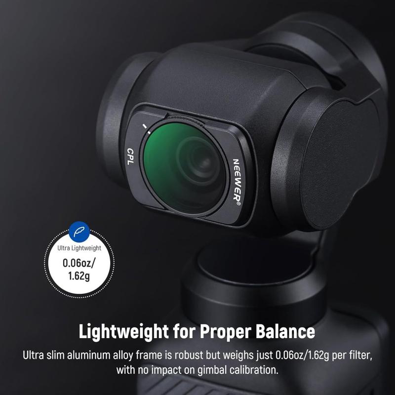 Cada filtro pesa apenas 1,62 g (0,06 oz), assegurando que o equilíbrio e o desempenho do gimbal não são comprometidos. O conjunto é fornecido com um estojo de proteção para filtros e um pano de limpeza, facilitando o armazenamento e a manutenção seguros.