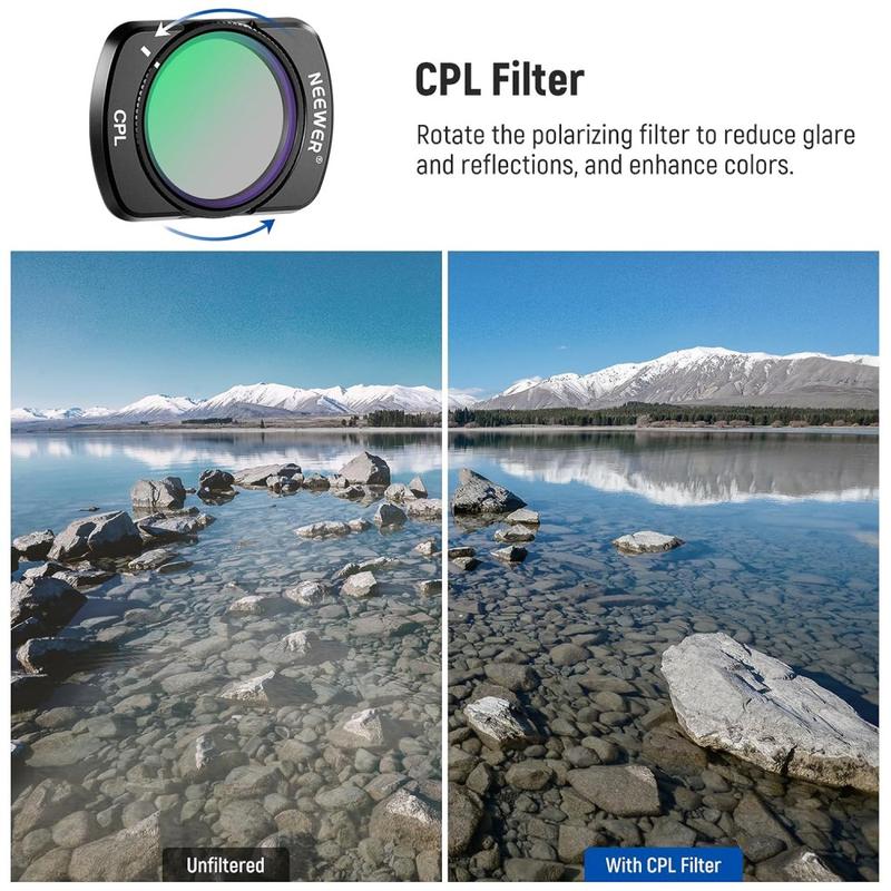 O filtro CPL (Circular Polarizer) incluído foi concebido para minimizar os reflexos e o brilho de superfícies não metálicas, como água e vidro. Ao filtrar a luz polarizada, melhora a saturação da cor e o contraste, resultando em imagens mais vibrantes e nítidas. Isto é particularmente benéfico para a fotografia de paisagens, onde a gestão dos reflexos e a obtenção de tons de cor ricos são cruciais.