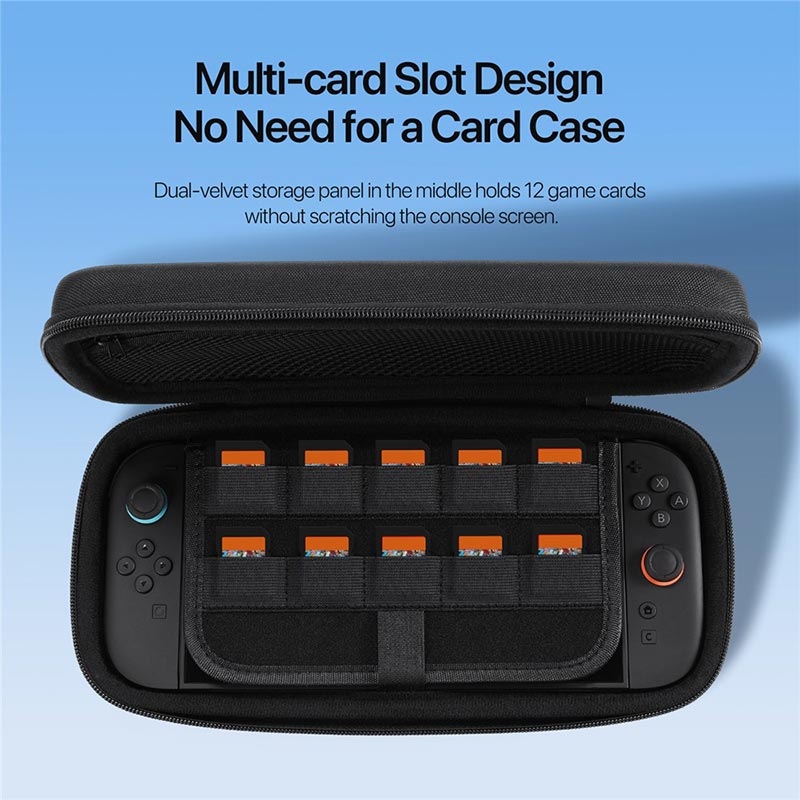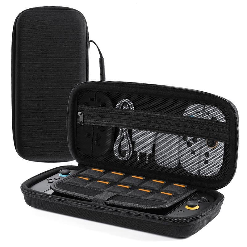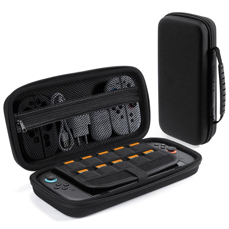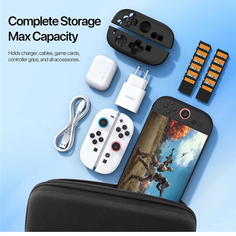 - Amplo espaço interior para carregadores, cabos de dados e pegas Joy-Con, mantendo tudo arrumado num só local