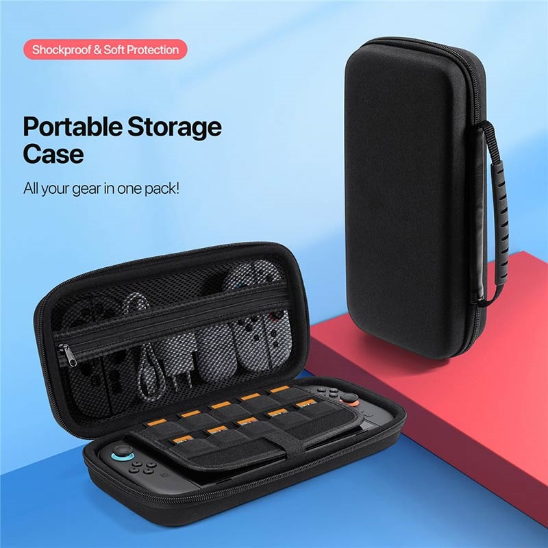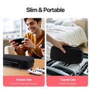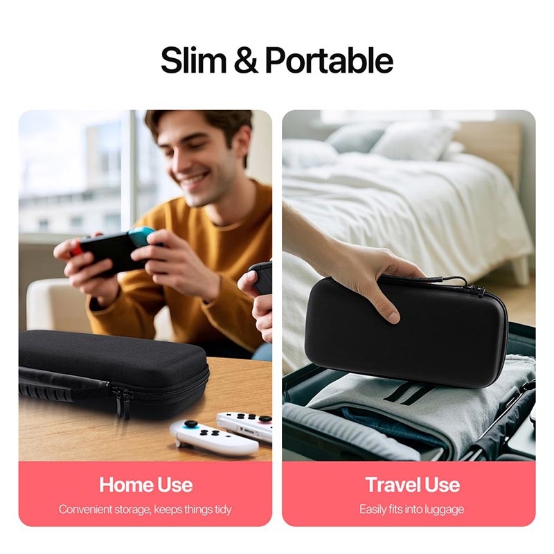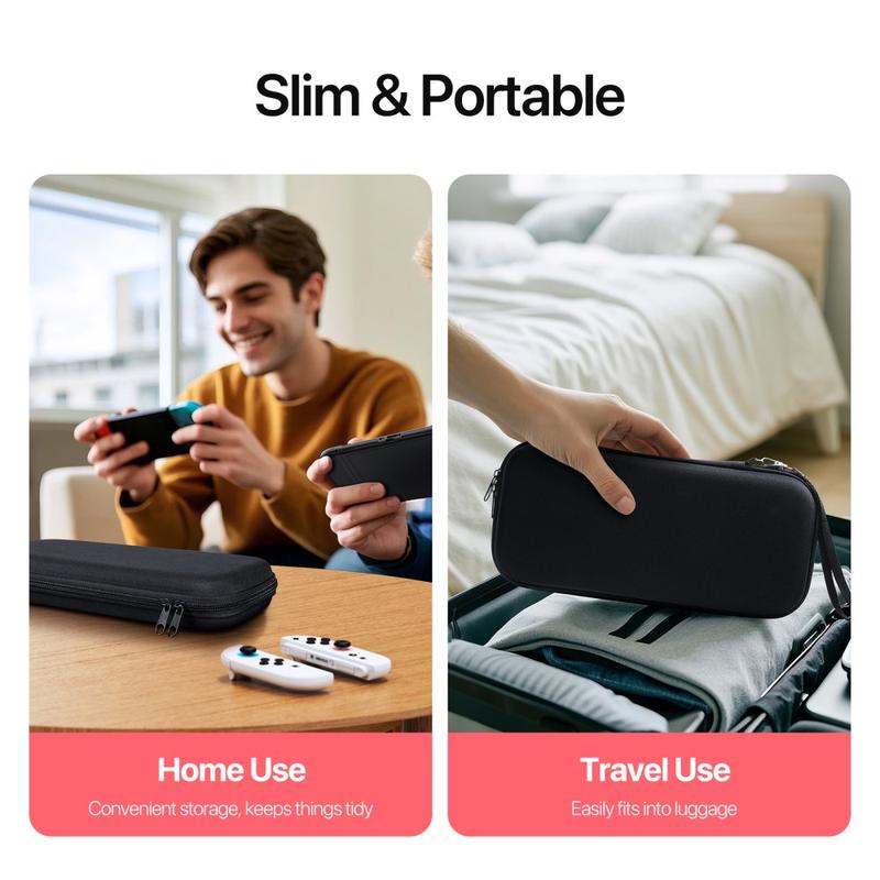 Proteja e organize a sua consola e acessórios onde quer que vá com esta bolsa de armazenamento fina e resistente a choques em preto clássico.