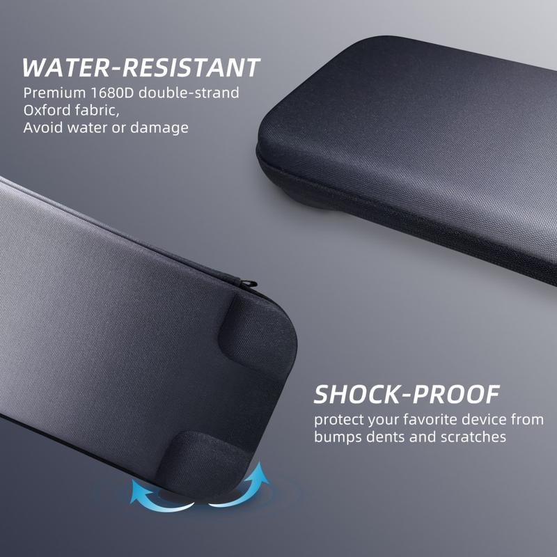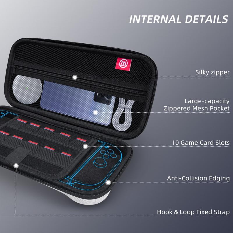 As bolsas macias podem esmagar e misturar acessórios com o ecrã. O design de compartimento duplo da JYS resolve ambos os problemas: um exterior rígido em EVA resiste à pressão, enquanto secções separadas impedem que os cabos ou adaptadores rocem na consola. Dez ranhuras para cartões significam que os seus títulos de topo viajam consigo - não são necessárias caixas extra.