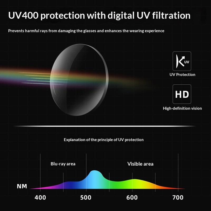 - As lentes de PC com revestimento UV400 ajudam a bloquear os raios UVA/UVB e a reduzir o desconforto causado pelo brilho em condições de luminosidade intensa
