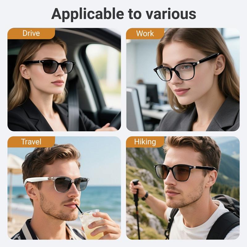 Auriculares, aparelhos de tradução e óculos de sol separados adicionam volume e cabos. O GT-35 funde-os, proporcionando um som nítido, proteção para os olhos e tradução instantânea num único acessório sem botões - ideal para viagens, trabalho e vida quotidiana.
