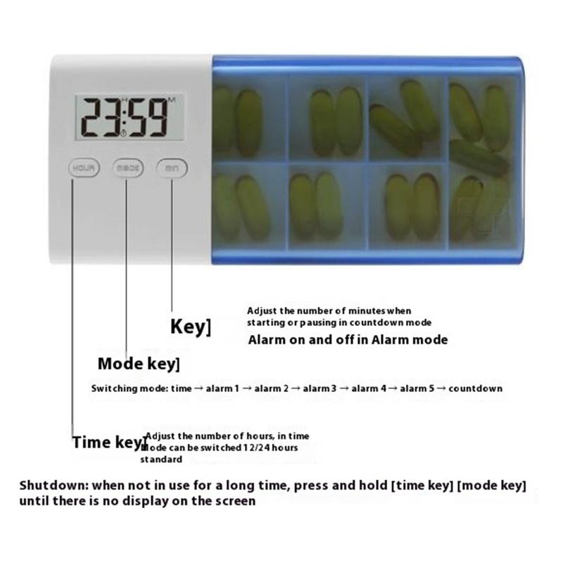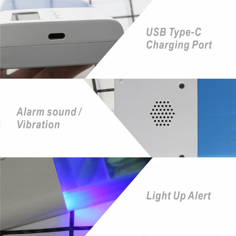 - Temporizador de contagem decrescente (até 23 h 59 min) com vibração + som - ideal para dosagem flexível ou medicação de curta duração