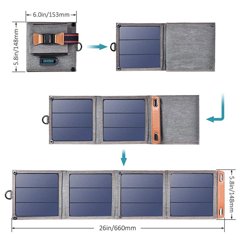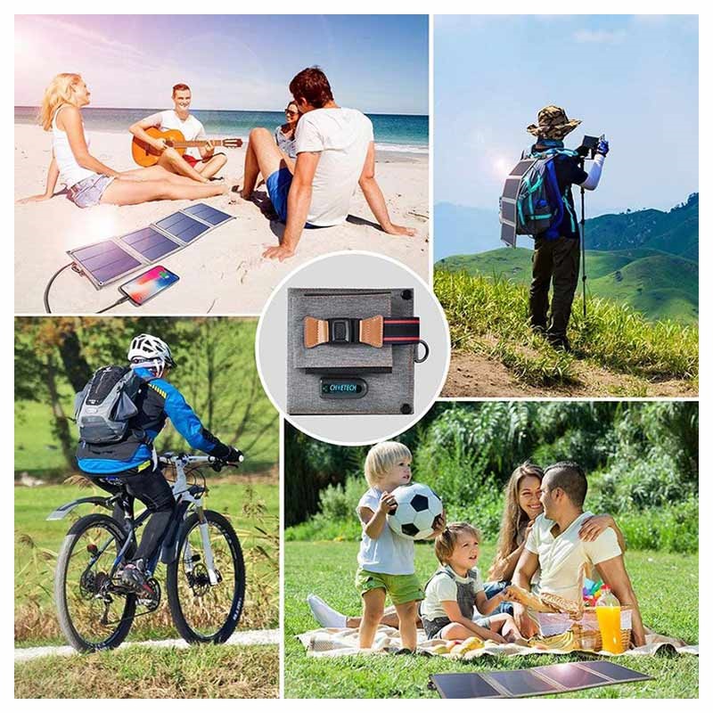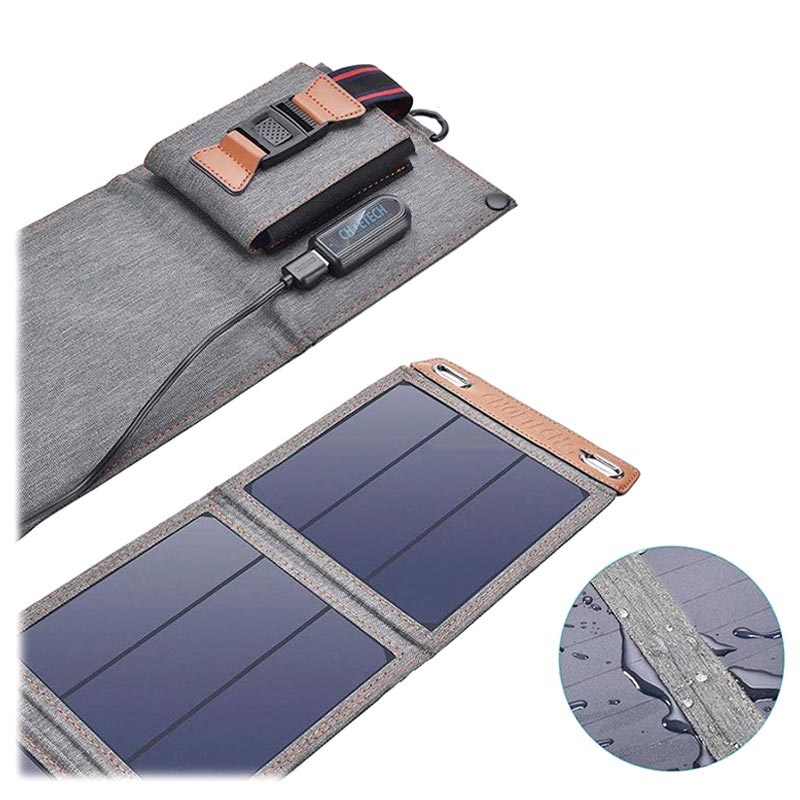 O painel solar Choetech com uma potência total de 14W pode carregar os seus dispositivos de forma segura e eficiente, através da porta USB-A. Alimente de forma rápida o seu smartphone, tablet, GPS, câmara digital, leitor de MP3, ou powerbank, utilizando apenas a energia do sol. Um chip inteligente integrado deteta automaticamente o dispositivo ligado e fornece uma potência ideal para garantir um carregamento seguro. O carregador solar Choetech é perfeito para todas as atividades ao ar livre, tais como acampar, caminhar e andar de bicicleta. Graças aos painéis à prova de água, pode transportá-lo na sua mochila em todas as condcições climatéricas.