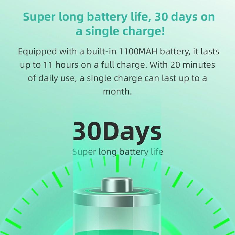 - Bateria de longa duração: Alimentado por uma bateria de 1100mAh, o dispositivo proporciona até 11 horas de funcionamento com um único carregamento de 1,5 horas, garantindo sessões de relaxamento muscular ininterruptas.