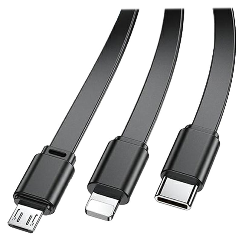 - Com cabo 3 em 1: Lightning, microUSB e USB-C