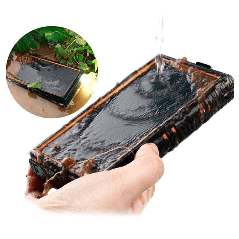 - O powerbank solar é feito de materiais duradouros que o tornam à prova de choques, à prova de poeira e à prova de água