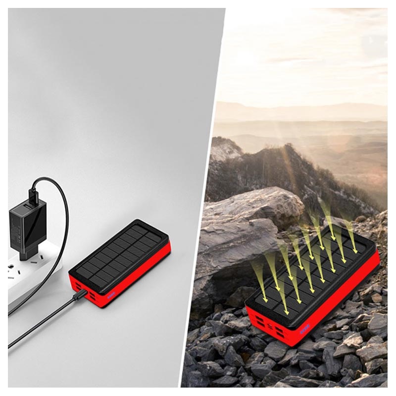 O painel solar, as quatro saídas e a grande capacidade tornam este power bank o companheiro ideal de viagem, acampamento e excursão. Está equipado com um painel solar monocristalino de silício, portas de entrada MicroUSB e USB Tipo-C, e quatro portas de saída USB-A. Pode, por isso, carregar simultaneamente vários dispositivos. O chip inteligente integrado detecta automaticamente o dispositivo ligado, fornecendo-lhe a potência ideal para um carregamento eficiente e seguro.