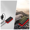 - Pode ser recarregado através do painel solar ou das portas MicroUSB e USB-C