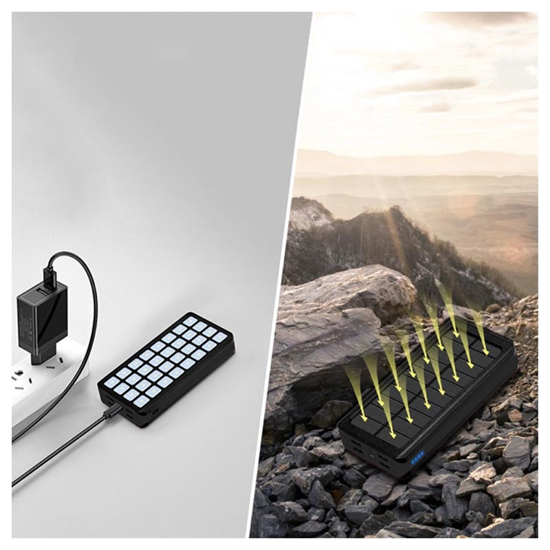 Este power bank tem um grande painel solar que o recarrega sob luz solar direta. Isto é perfeito quando não tem acesso a uma tomada elétrica. Os 32 LEDs incorporados fornecem luz forte para que possa desfrutar de atividades ao ar livre, mesmo quando o sol se põe.