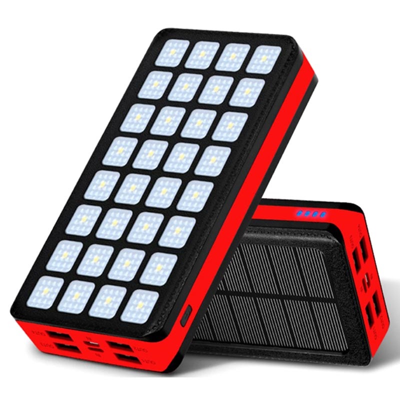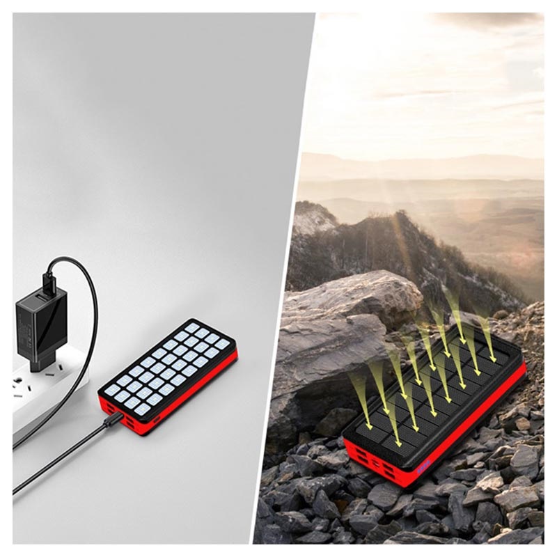 Este power bank tem um grande painel solar que o recarrega sob luz solar direta. Isto é perfeito quando não tem acesso a uma tomada elétrica. Os 32 LEDs incorporados fornecem luz forte para que possa desfrutar de atividades ao ar livre, mesmo quando o sol se põe.