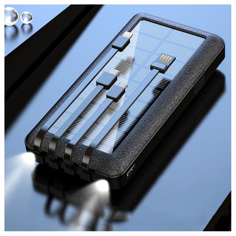 Graças aos cabos Lightning, USB-C, USB-A e MicroUSB incorporados, poderá carregar quase todos os dispositivos recarregáveis modernos, mesmo que se tenha esquecido do cabo original em casa. Existem, ainda, mais duas portas de entrada para carregar o banco de energia, via microUSB ou USB-C, e uma porta de saída de alta velocidade USB-A. O painel solar monocristalino de silício proporciona mais opções de configuração em condições de boa luz exterior. O power bank solar Psooo PS-159 ilumina as horas escuras com as suas duas luzes LED incorporadas.