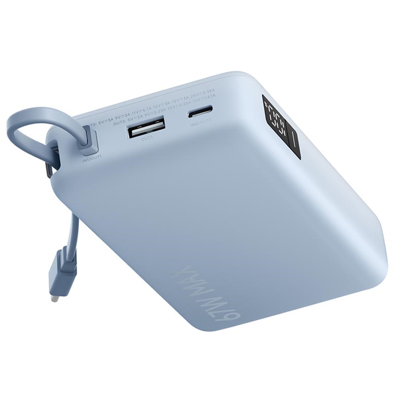 Um cabo USB-C integrado está incorporado no design para maior comodidade - é flexível, durável e pode funcionar como um cordão para facilitar o transporte. O visor digital mostra a percentagem da bateria em tempo real e os principais estados de carregamento num piscar de olhos, para que saiba sempre quanta energia ainda tem. Com três saídas (cabo USB-C integrado, USB-C, USB-A), pode carregar até três dispositivos ao mesmo tempo e manter os seus itens essenciais em funcionamento.