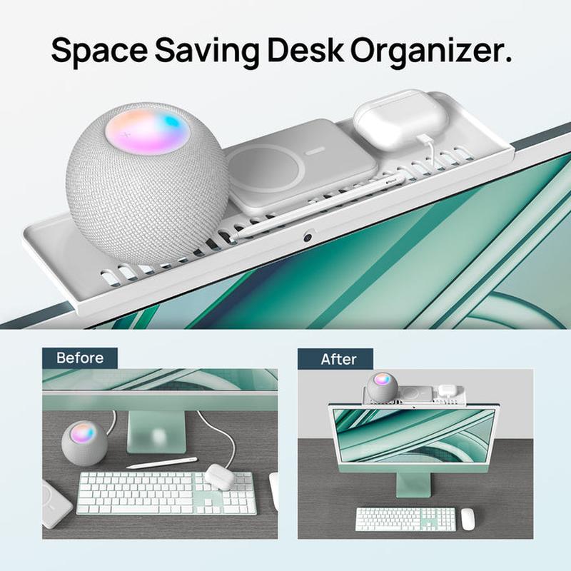 - Design compacto: Poupa espaço na secretária ao adicionar uma prateleira de arrumação extra.