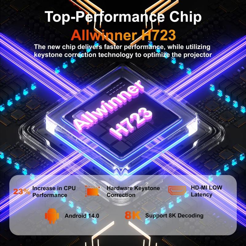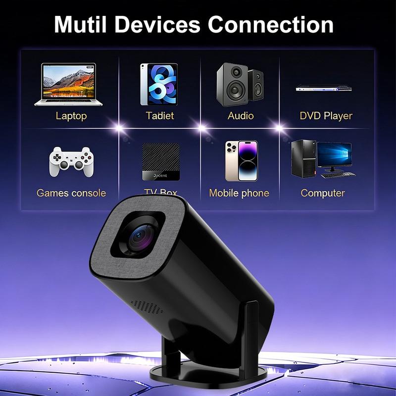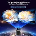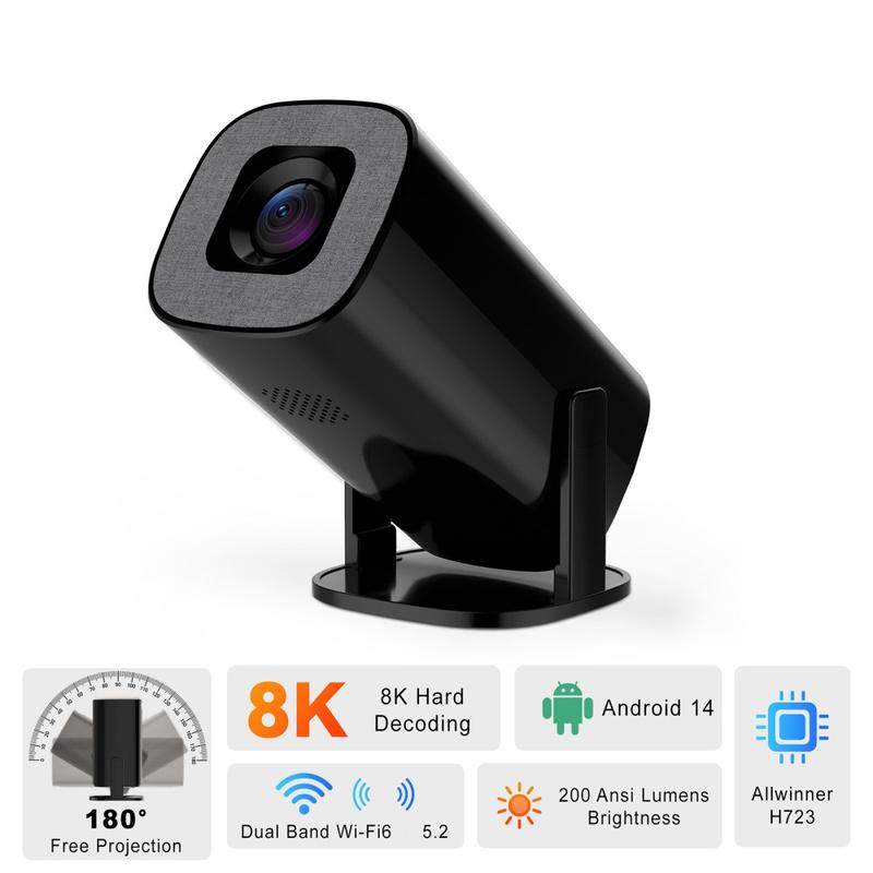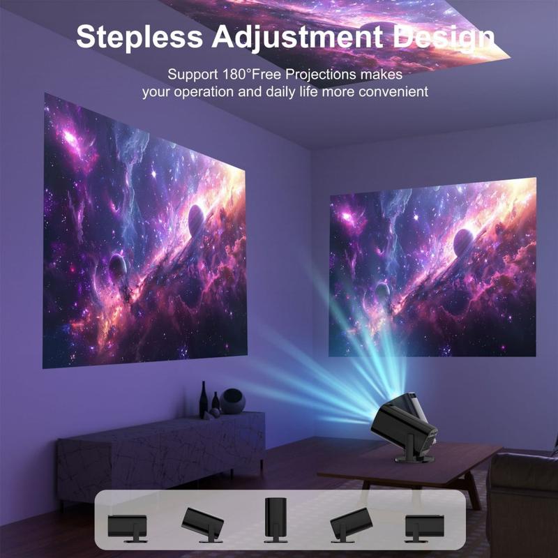 Projetor portátil V1 Android 14 (200 ANSI) - 720p nativo, distorção trapezoidal automática, inclinação de 180°, WiFi 6 de banda dupla e Bluetooth 5.2, 1 GB/8 GB
