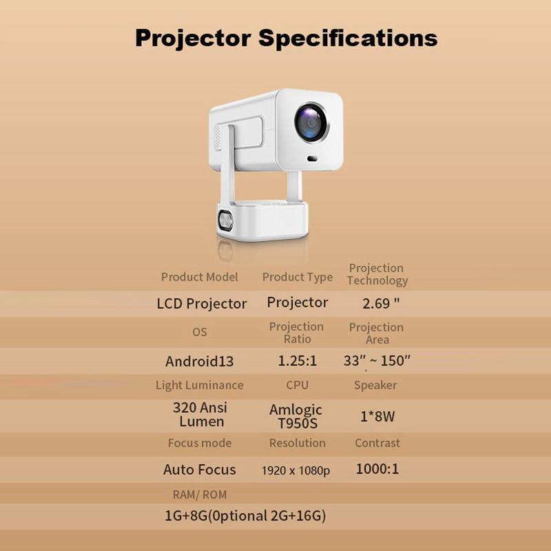 O projetor utiliza tecnologia de ecrã LCD com uma fonte de luz LED branca e suporta tamanhos de projeção de 30 a 200 polegadas a distâncias de 1,2 m a 6 m. O foco automático e a correção automática de distorção ajudam a simplificar a configuração, enquanto a relação de projeção de 1,4:1 permite um posicionamento flexível em diferentes espaços interiores. Também suporta vários modos de projeção, incluindo frontal, traseira, teto e teto traseiro.