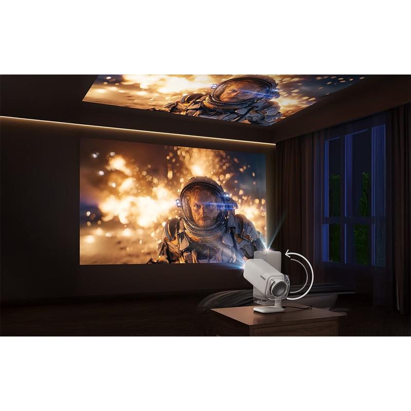 A configuração foi concebida para ser rápida e sem mãos. O Real-Time Focus utiliza a medição de distância ToF para manter a imagem nítida, enquanto a correção trapezoidal elétrica ajusta a geometria automaticamente quando o projetor está inclinado. O Auto Screen Alignment ajusta a imagem à sua superfície de projeção e o Auto Obstacle Avoidance ajuda a manter a imagem nítida quando há algo no caminho. A base ajustável (até 110 graus) facilita a projeção numa parede ou no teto, e o design compacto, além do suporte para alimentação USB-C, significa que pode levá-lo para o exterior com um carregador PD ou power bank adequado.