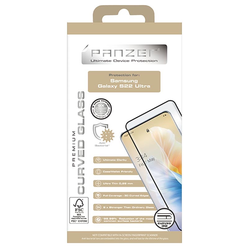 Proteção máxima do ecrã - o Panzer Premium 3D vidro curvo temperado para Samsung Galaxy S22 Ultra 5G tem cantos lisos e arredondados e cobre todo o ecrã, sem lacunas.