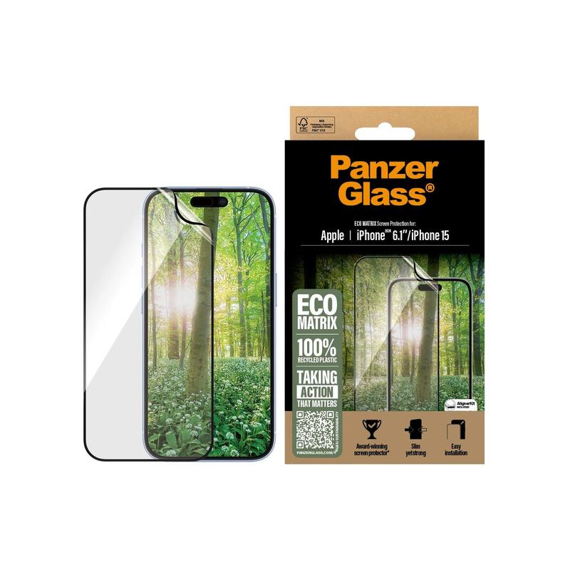 Protetor de ecrã PanzerGlass Eco Matrix Ultra-Wide Fit com EasyAligner para iPhone 15, iPhone 16 - 100% reciclado