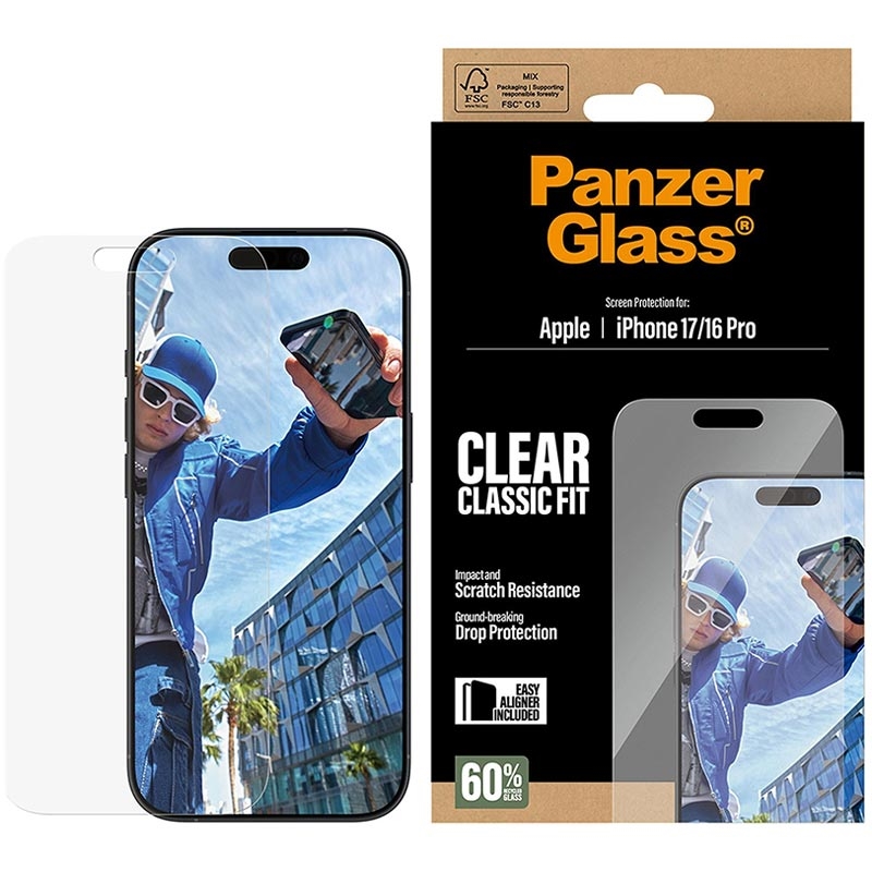 Proteja o seu iPhone 17, iPhone 16 Pro com o Protetor de ecrã PanzerGlass Classic Fit - concebido para resistir a riscos, choques e quedas esmagadoras. Fabricado com 60% de vidro reciclado, oferece a mesma resistência intransigente, contribuindo para um futuro mais sustentável.