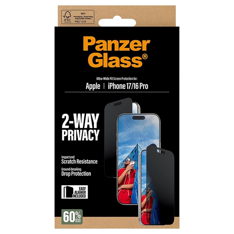 PanzerGlass Protetor de ecrã de vidro temperado de privacidade bidirecional EasyAligner Ultra-Wide Fit para iPhone 17, iPhone 16 Pro