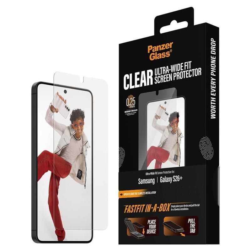 O protetor de ecrã PanzerGlass Ultra-Wide Fit para Samsung Galaxy S26+ foi concebido para uma instalação rápida e sem bolhas, graças ao inovador sistema FASTFIT IN-A-BOX. Basta colocar o Samsung Galaxy S26+ virado para cima, puxar a patilha e desfrutar sempre de um protetor perfeitamente alinhado - sem pó, sem frustração.
