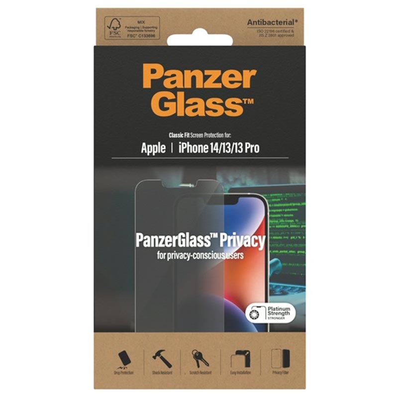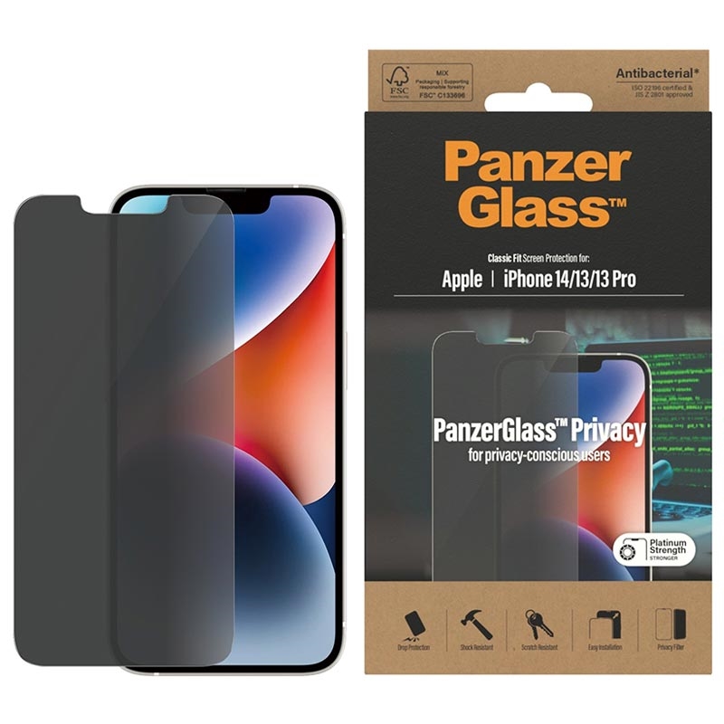 Protetor de Ecrã em Vidro Temperado PanzerGlass Classic Fit Privacy AntiBacterial para iPhone 13, iPhone 13 Pro, iPhone 14
