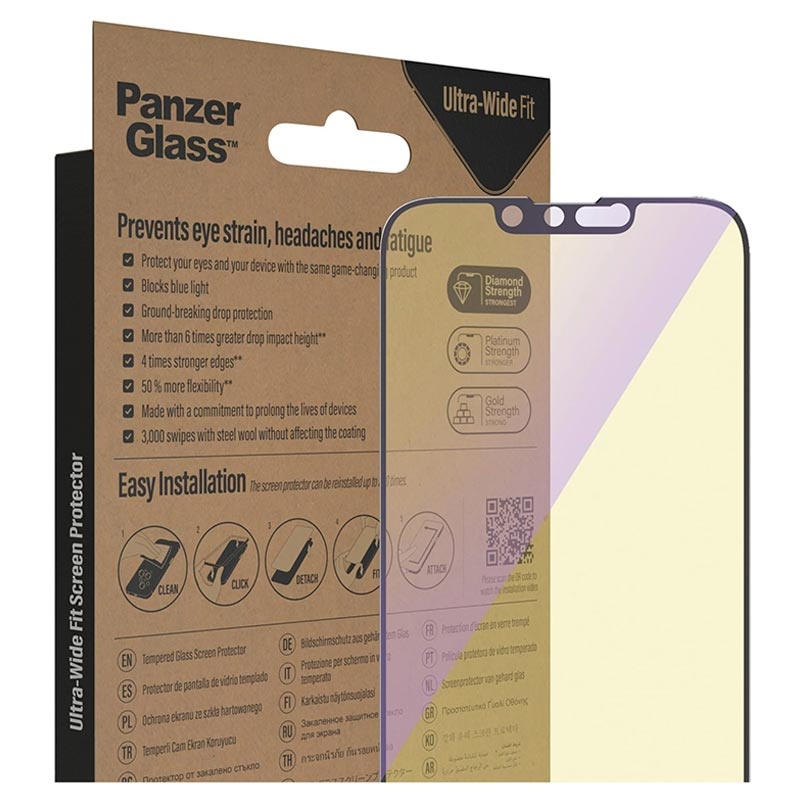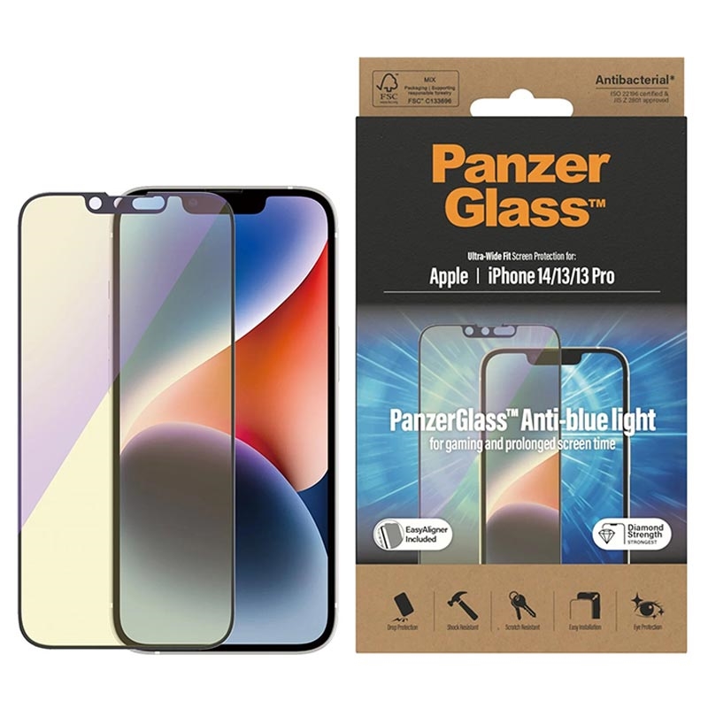 Protetor de Ecrã em Vidro Temperado PanzerGlass Ultra-Wide Fit Anti-Blue Light EasyAligner AntiBacterial para iPhone 13, iPhone 13 Pro, iPhone 14