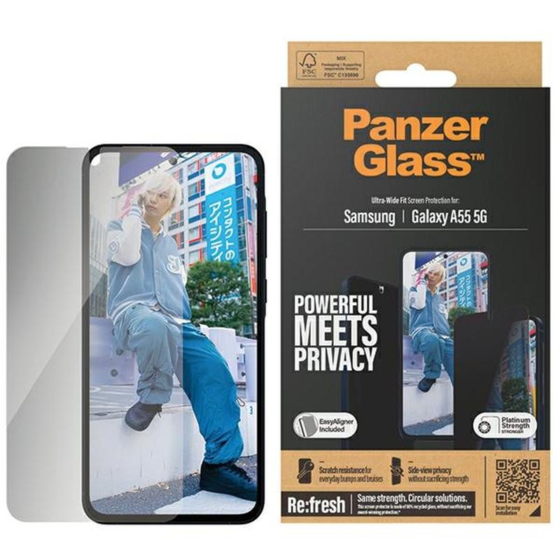 Diga adeus aos olhares indiscretos e olá à paz de espírito - o vidro temperado de privacidade PanzerGlass Ultra-Wide Fit com EasyAligner para Samsung Galaxy A55 manterá suas mensagens privadas ou dados bancários seguros. Ele também oferece proteção imbatível contra arranhões, choques acidentais e manchas, graças ao seu vidro temperado de nível de diamante desenvolvido pela PanzerGlass.