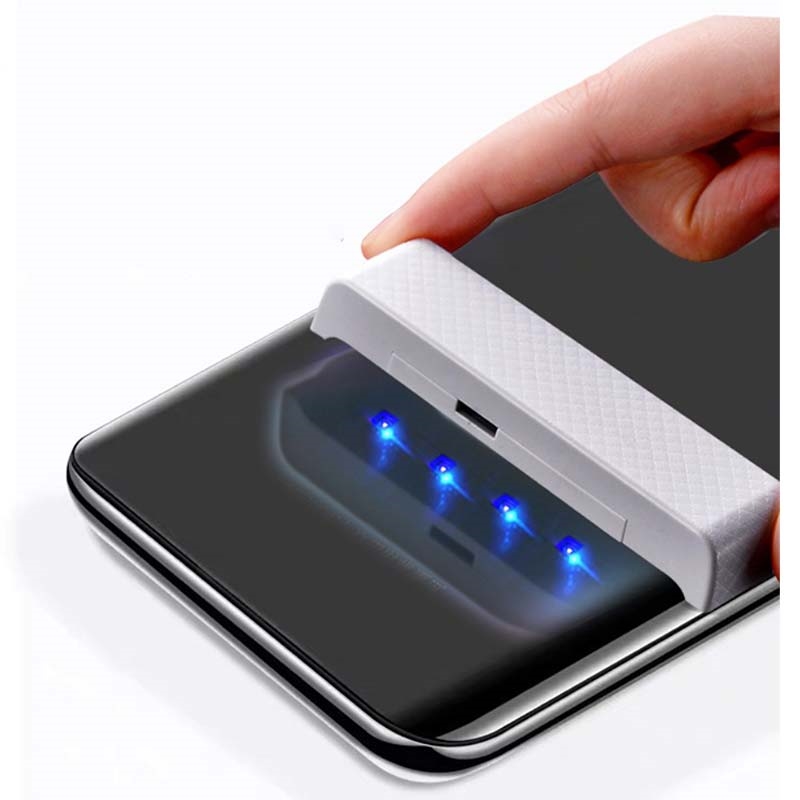 - Coloque cuidadosamente o protetor de tela de vidro temperado na tela do dispositivo e espere que a cola UV se espalhe totalmente sem pressionar