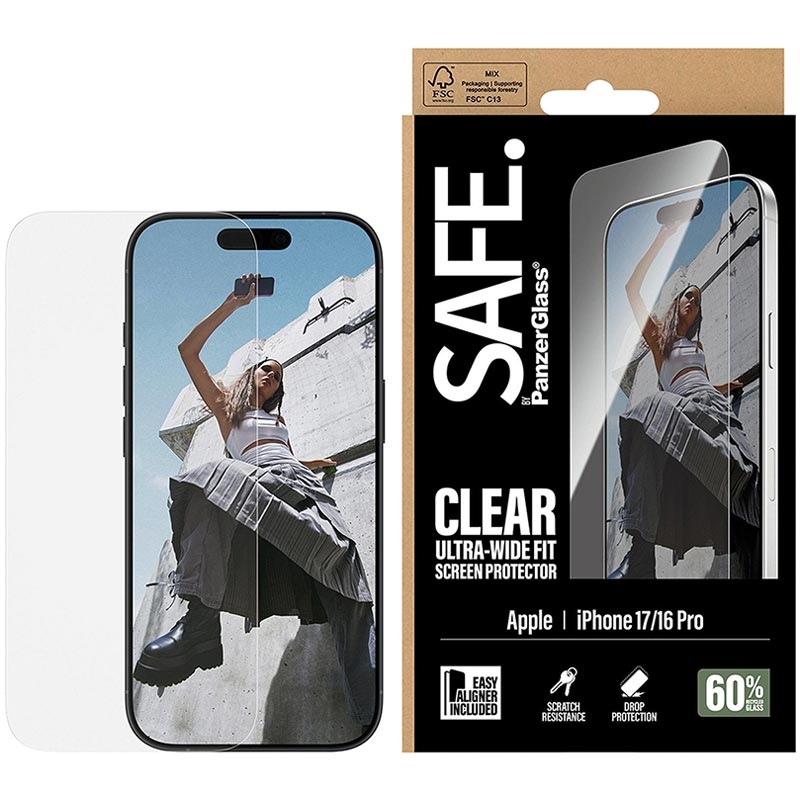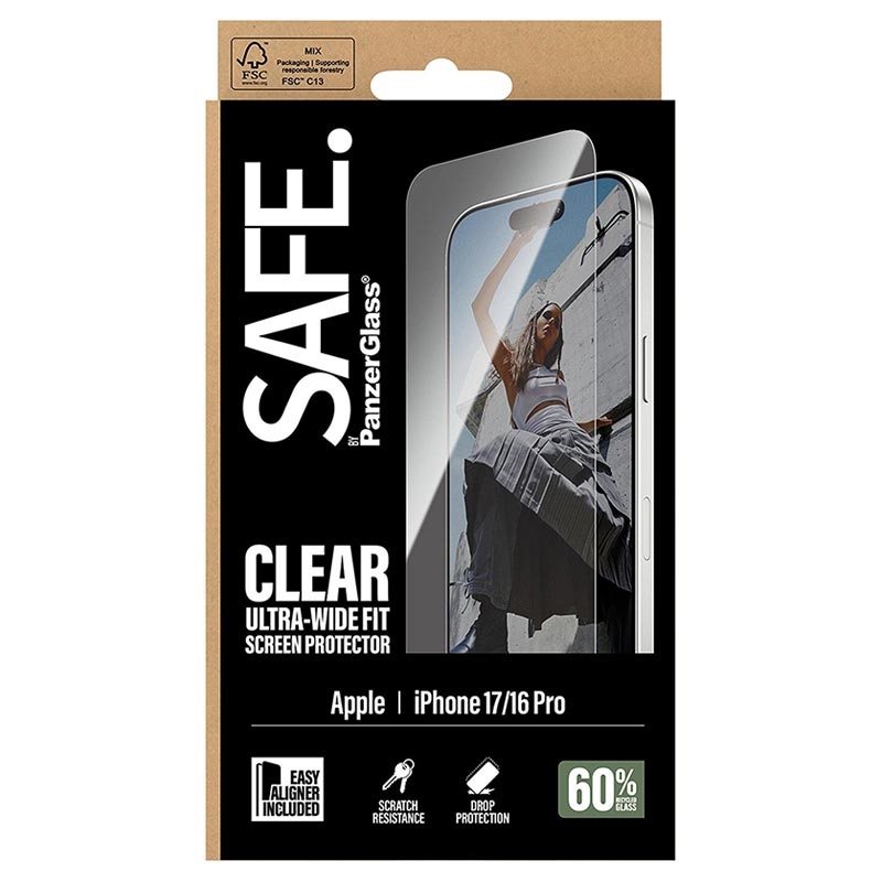 O Protetor de ecrã SAFE. by PanzerGlass para iPhone 17, iPhone 16 Pro oferece uma proteção superior com 60% de vidro reciclado, protegendo o seu dispositivo de quedas, riscos e choques. O seu ajuste ultra largo garante uma cobertura total e uma visibilidade clara do ecrã, enquanto o revestimento resistente a impressões digitais mantém o ecrã limpo. Com 100% de sensibilidade ao toque e fácil instalação utilizando o EasyAligner incluído, este protetor de ecrã combina perfeitamente sustentabilidade e funcionalidade.