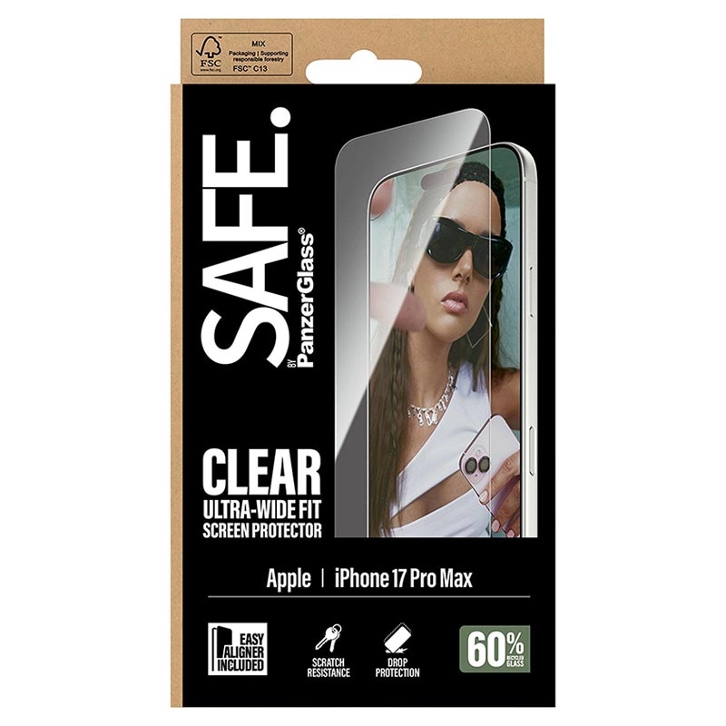 O Protetor de ecrã SAFE. by PanzerGlass para iPhone 17 Pro Max oferece uma proteção superior com 60% de vidro reciclado, protegendo o seu dispositivo de quedas, riscos e choques. O seu ajuste ultra largo garante uma cobertura total e uma visibilidade clara do ecrã, enquanto o revestimento resistente a impressões digitais mantém o ecrã limpo. Com 100% de sensibilidade ao toque e fácil instalação utilizando o EasyAligner incluído, este protetor de ecrã combina perfeitamente sustentabilidade e funcionalidade.
