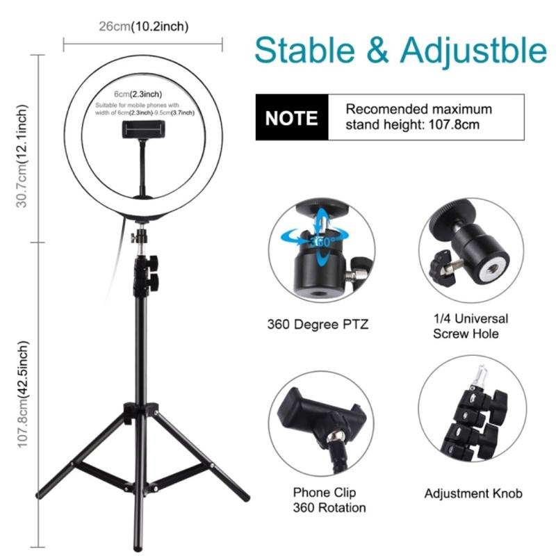 O anel de luz LED pode ser montado no suporte e levado para qualquer lado, também pode ser retirado do suporte em qualquer altura, a cabeça esférica do tripé pode rodar 360 graus e pode ser ajustada livremente a qualquer ângulo (o suporte não está incluído)