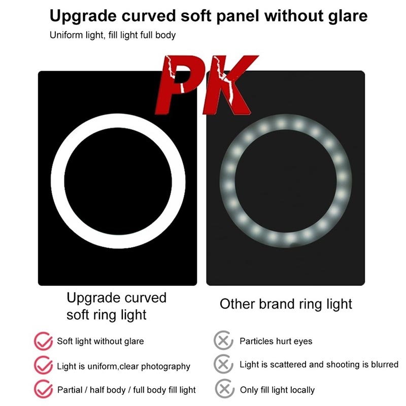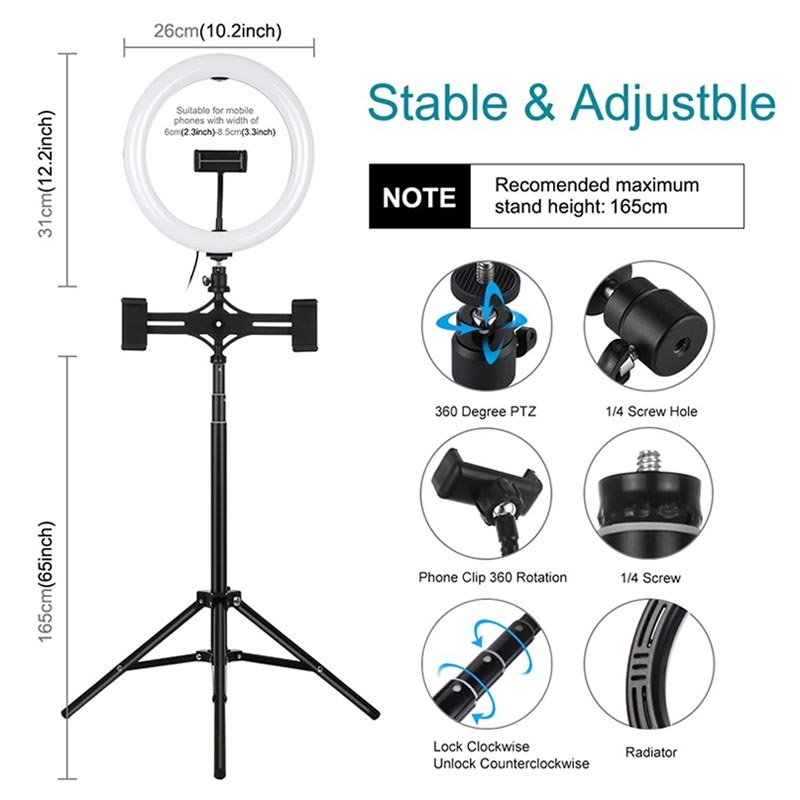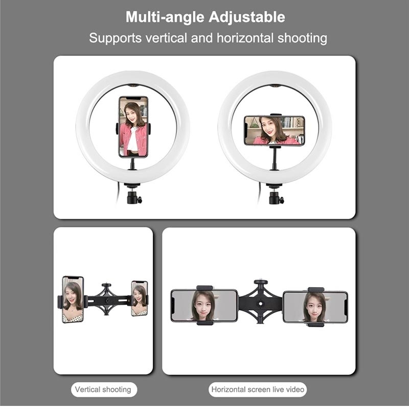 O anel luminoso LED pode ser montado no suporte e levado para qualquer lugar, também pode ser retirado do suporte em qualquer altura, a cabeça esférica do tripé pode rodar 360 graus e pode ser ajustada livremente a qualquer ângulo