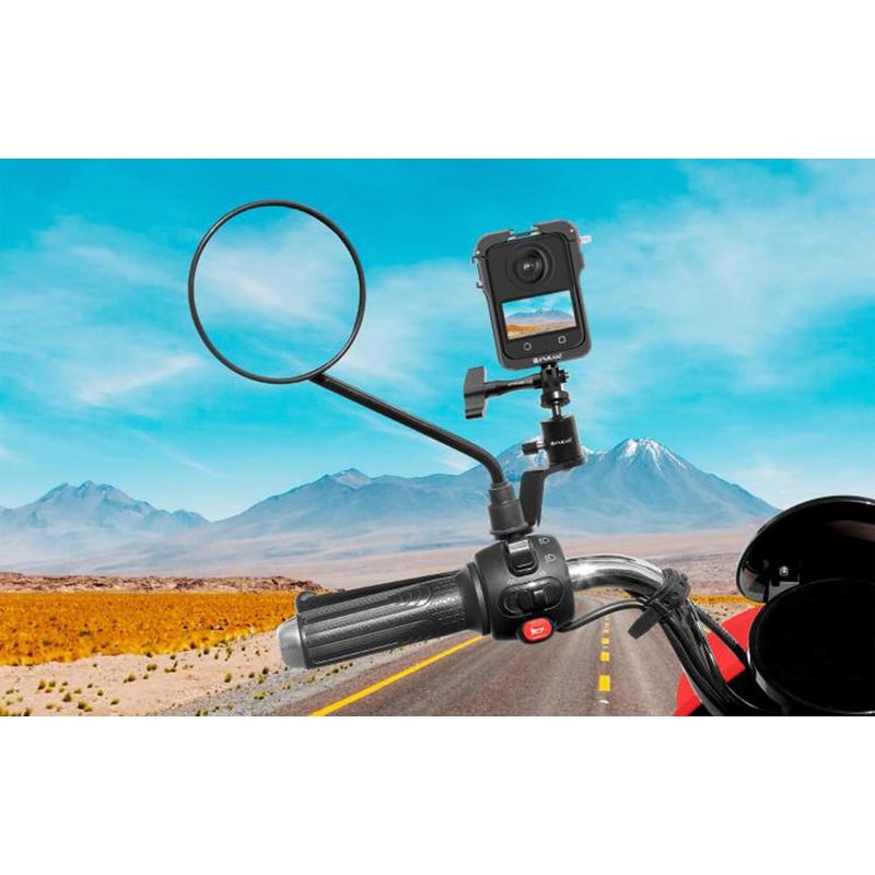 Suporte para câmara retrovisora de motocicleta em alumínio Puluz PU1056B - rotação de 360 graus, rosca de 1/4" + suporte GoPro, carga máxima de 2 kg, compatível com parafusos de espelho de 10 mm