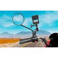 Os suportes para espelho são populares para filmagens de ação porque ficam altos e à frente, muitas vezes proporcionando uma visão natural da estrada, mantendo a câmara fora do caminho. Uma cabeça esférica combinada com botões de bloqueio também é útil em motociclos, pois permite ajustar o ângulo com precisão e, em seguida, bloqueá-lo firmemente, ajudando a reduzir o movimento causado pela vibração em alta velocidade.