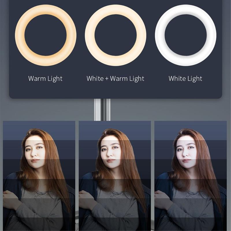 Existem opções de modo de luz de 3 cores, suporte ajustável de 9 marchas, o anel de luz de 8 polegadas proporciona uma iluminação suave e encantadora que ajuda a suavizar as sombras e a esconder as imperfeições da pele, perfeita para videoconferência, chamadas de zoom, transmissão em direto, auto-transmissão, ensino em linha e sessão de maquilhagem