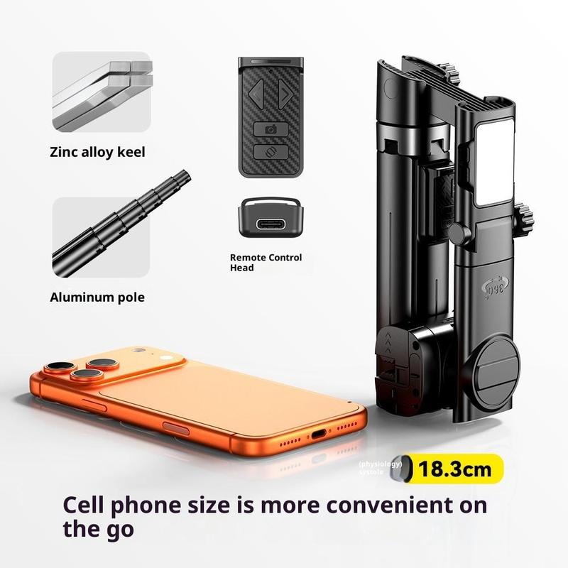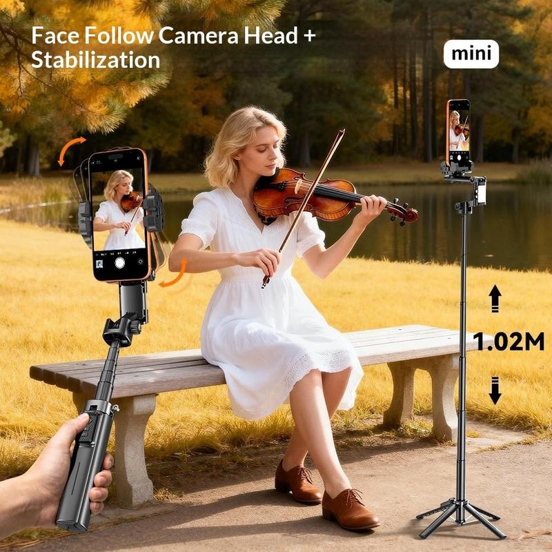 Crie conteúdos mais suaves e flexíveis com o bastão para selfies com estabilizador de cardã Q37 AI. Concebido para transmissões ao vivo, selfies, gravação de vídeo, videochamadas e criação de conteúdo no dia a dia, este acessório multifuncional combina rastreamento facial por IA, alcance extensível, suporte para tripé, estabilização, iluminação RGB e controlo remoto sem fios num design compacto. A sua haste em liga de alumínio estende-se de 18,3 cm a 1,02 m, oferecendo-lhe mais liberdade para ajustar o enquadramento, a distância de filmagem e o ângulo para diferentes cenas.