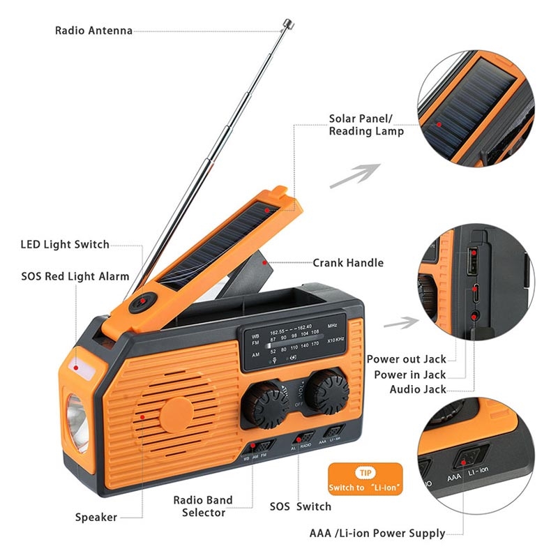 Rádio de emergência multifuncional com manivela solar e SOS, banco de potência, lanterna HY-068 - AM/FM/NOAA, 5000mAh