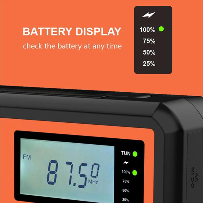 - Funções: Ecrã digital LCD, alimentação solar, altifalante, SOS, antena de alta sensibilidade, tomada para auscultadores, manivela