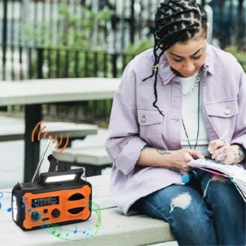 O rádio com banda meteorológica integrada permite-lhe receber alertas e atualizações de emergência, enquanto a lanterna LED brilhante de 3W fornece iluminação fiável. Uma luz de leitura giratória separada de 180 graus torna-a conveniente para leitura, reparações ou trabalho com pouca luz. Quando há luz solar disponível, o painel solar ajuda a recarregar a bateria interna, e a manivela integrada fornece geração de energia de reserva quando necessário.