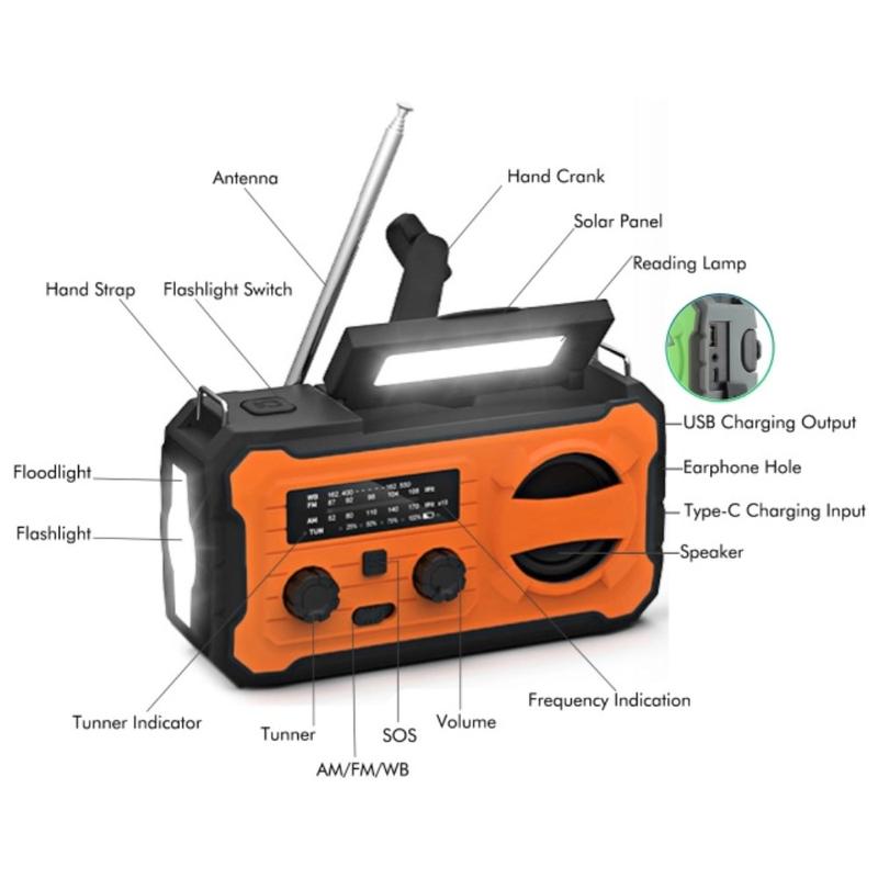 - Ferramenta de sobrevivência multifuncional: rádio, lanterna, luz de leitura, carregador solar e banco de energia