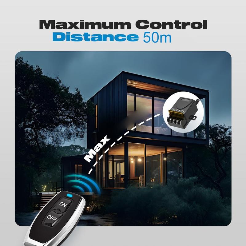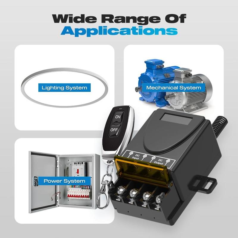 Controle os seus dispositivos alimentados por corrente contínua sem fios com este kit de interruptor de relé RF de 433MHz, concebido para uma operação remota conveniente de ligar/desligar numa ampla gama de aplicações. Adequado para sistemas de 12 V a 72 V, pode ser utilizado com iluminação LED, ventiladores, motores, bombas e configurações selecionadas de segurança ou automação. O recetor incluído e os dois controlos remotos proporcionam uma operação flexível para projetos domésticos, oficinas, garagens, portões e controlo de equipamentos.