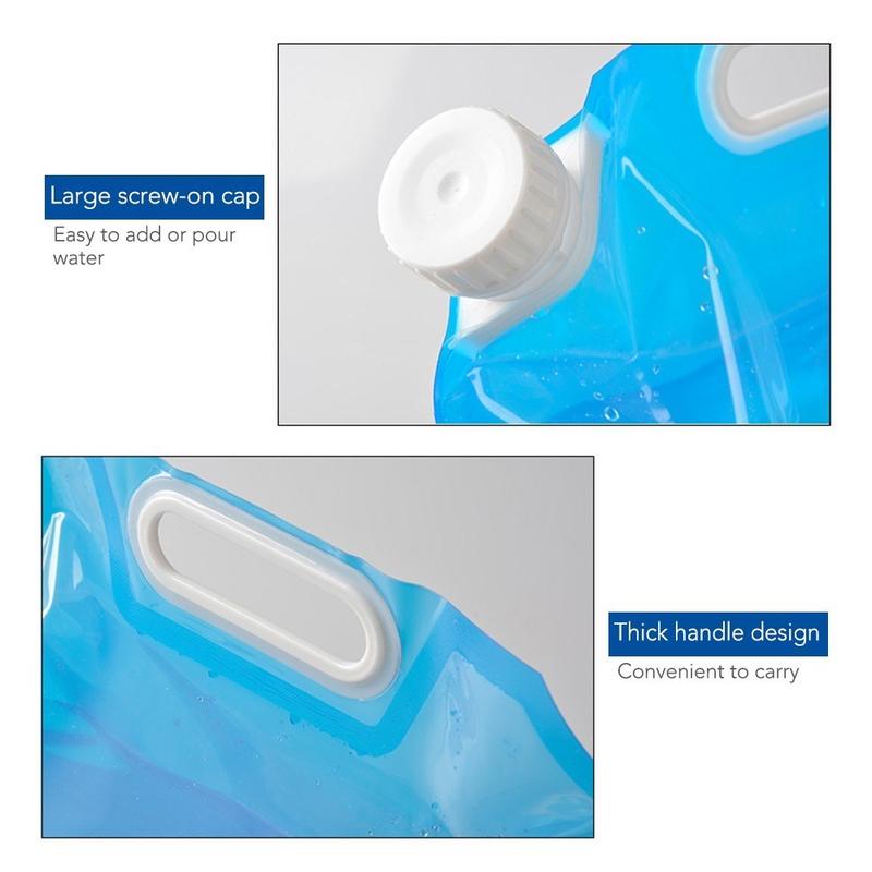 O recipiente de água dobrável é perfeito para atividades ao ar livre, como camping, caminhada e mochila, bem como para situações de emergência de sobrevivência. Feito de material de PVC de alta qualidade, não contém BPA e não confere sabor ou cheiro à água armazenada em seu interior. A boca grande permite reabastecer e despejar facilmente, enquanto a tampa de rosca garante que a água fique selada no saco e evite vazamentos. A alça durável facilita o transporte do recipiente quando ele está cheio de água, e o design dobrável e leve permite armazenamento e transporte convenientes.