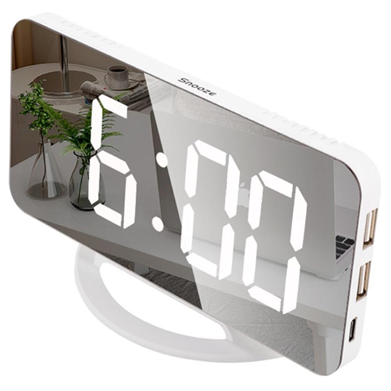 Desfrute da utilização deste despertador moderno e minimalista, que também pode ser usado como espelho. Equipado com três níveis de luminosidade que serão ajustados automaticamente, ou que pode definir manualmente. O botão de soneca (snooze) é sensível ao toque e fácil de alcançar, e usando as duas saídas USB-A poderá carregar smartphones. Vem com um suporte destacável para que o possa colocar sobre uma secretária ou parede.